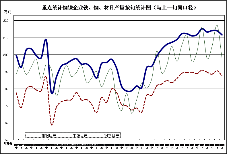 根據(jù)重點統(tǒng)計鋼鐵企業(yè)產量估算,本旬全國共生產粗鋼2961.27萬噸,日產粗鋼296.13萬噸、環(huán)比下降0.57%、同比增長6.41%;生產生鐵2496.00萬噸,日產生鐵249.60萬噸、環(huán)比下降1.28%、同比增長7.68%;生產鋼材3707.84萬噸,日產鋼材370.78萬噸、環(huán)比下降1.23%、同比增長12.33%。本月累計平均日產,全國粗鋼環(huán)比下降1.67%、同比增長6.41%,生鐵環(huán)比下降1.03%、同比增長7.68%,鋼材環(huán)比下降1.66%、同比增長12.33%。