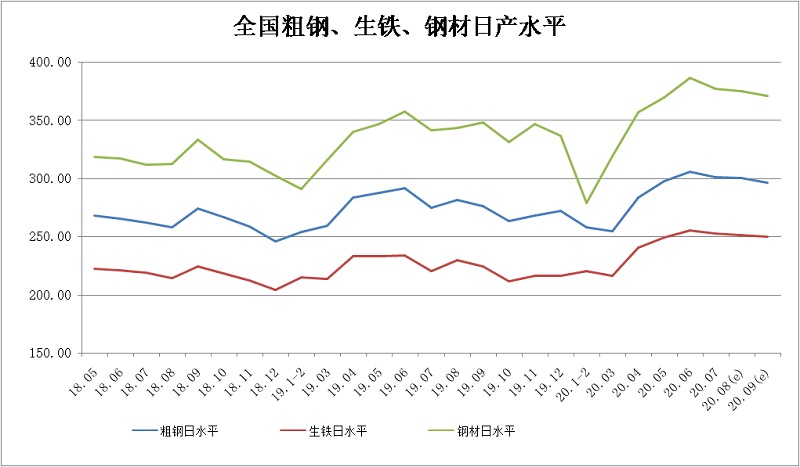 2020年9月上旬,重點統(tǒng)計鋼鐵企業(yè)共生產粗鋼2136.56萬噸、生鐵1896.16萬噸、鋼材1999.30萬噸、焦炭319.28萬噸。本旬平均日產,粗鋼213.66萬噸,環(huán)比下降1.09%、同比增長6.73%;生鐵189.62萬噸,環(huán)比下降1.55%、同比增長4.82%;鋼材199.93萬噸,環(huán)比下降8.86%、同比增長6.50%。
