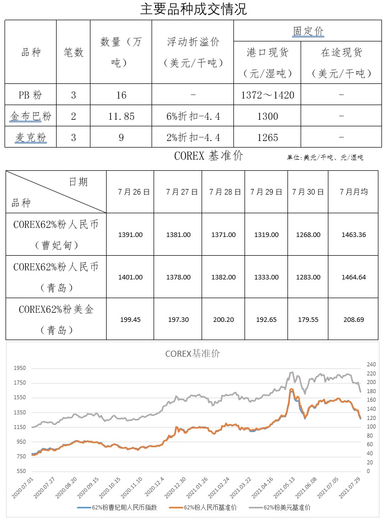 7月26日-7月30日成交11筆共46.65萬噸,其中在途1筆17萬噸,港口10筆29.65萬噸。