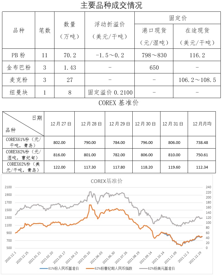 12月27日-12月31日成交30筆共131.16萬噸,其中在途11筆111.5萬噸,港口19筆19.66萬噸。