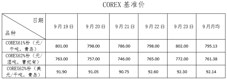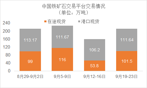 9月19日~9月23日成交105筆共213.14萬噸,其中在途8筆共101.5萬噸,港口97筆共111.64萬噸。主要成交品種包括:PB粉28筆共69.87萬噸,金布巴混合粉17筆共20.49萬噸,麥克粉13筆共24.71萬噸,FMG超特粉3筆共4.1萬噸,FMG混合粉4筆共4.02萬噸, BRBF 1筆共17萬噸,卡拉加斯粉2筆共2萬噸。