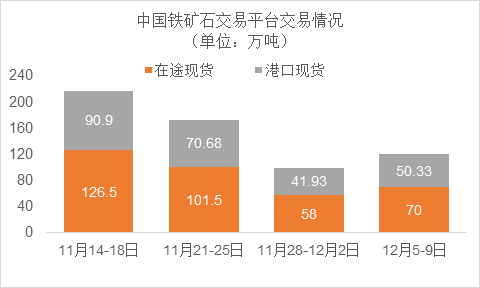 12月5日~12月9日成交50筆共120.33萬噸,其中在途7筆共70萬噸,港口43筆共50.33萬噸。主要成交品種包括:PB粉18筆共45.2萬噸,金布巴混合粉7筆共13.6萬噸,麥克粉6筆共21.8萬噸,紐曼粉3筆共11萬噸,FMG超特粉3筆共5.7萬噸,FMG混合粉3筆共3.2萬噸。
