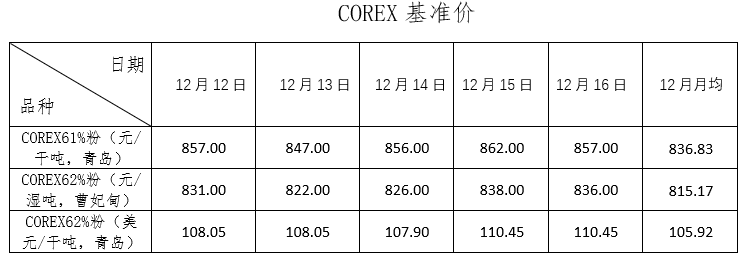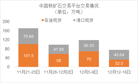 12月12日~12月16日成交41筆共76.13萬噸,其中在途4筆共32.5萬噸,港口37筆共43.64萬噸。主要成交品種包括:PB粉12筆共18.33萬噸,金布巴混合粉3筆共10萬噸,麥克粉2筆共2.1萬噸,紐曼塊1筆共8萬噸,BRBF 2筆共9.3萬噸,卡粉3筆共10萬噸,FMG混合粉2筆共1萬噸。