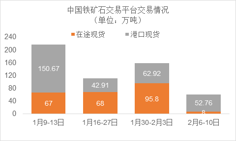 2月6日~2月10日成交58筆共60.76萬噸,其中在途1筆共8萬噸,港口57筆共52.76萬噸。主要成交品種包括:PB粉20筆共23.2萬噸,金布巴混合粉5筆共4萬噸,紐曼塊3筆共11萬噸,紐曼粉1筆共1.2萬噸,F(xiàn)MG超特粉6筆共4.26萬噸。